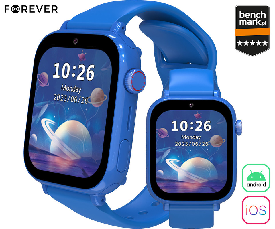 FOREVER Look Me! 3 KW-520 otroška pametna ura, 4G LTE, 1.85" zaslon, GPS+WiFi+LBS lociranje, video klici, SOS gumb, Android + iOS, aplikacija, IP65, pedometer, igre, modra (Electric Blue)
