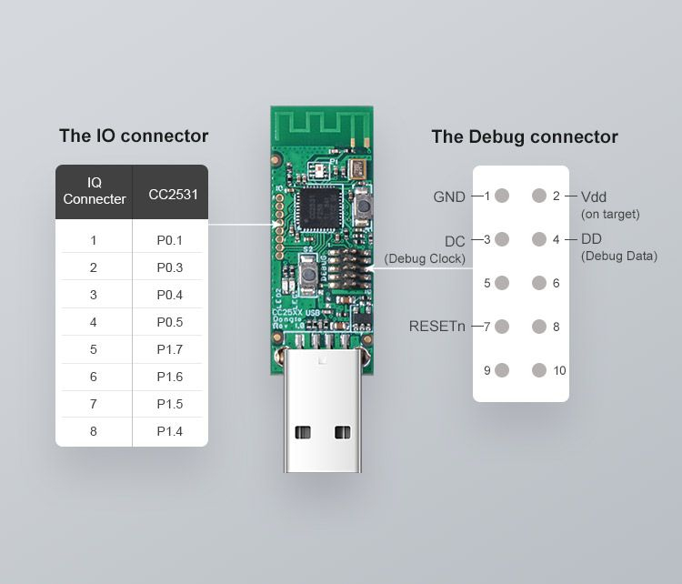 USB ključ CC2531 je naprava USB, ki služi kot računalniški vmesnik za aplikacije IEEE802.15.4 / ZigBee, prihaja z vdelano programsko opremo CC2531ZNP-Prod, USB ključ je mogoče priključiti neposredno na vaš PC/Raspberry itd.