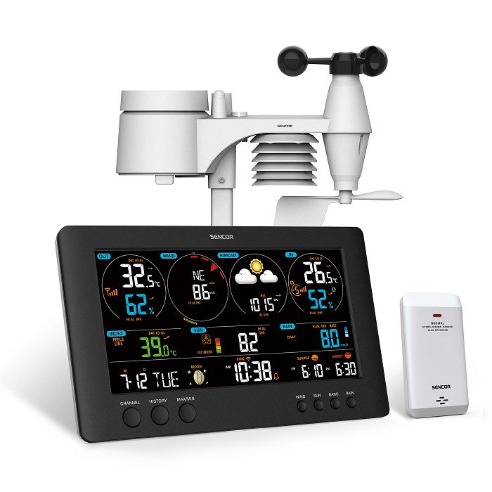 Profesionalna vremenska postaja SENCOR SWS 12500 WIFI ima: podporo za globalne on-line vremenske platforme "Weather Underground" in "Weathercloud"; možnost objavljanja podatkov lokalne vremenske postaje na javnih vremenskih platformah; podporo za pametne naprave, spletni dostop do podatkov in zgodovine. Dodatne tehnične lastnosti: WiFi profesionalna vremenska postaja z brezžičnim senzorjem 7 v 1 in senzorjem TH; TRUE BLACK barvit LCD zaslon z diagonalo 8,4" (21,4 cm); prilagoditev ravni kontrasta LCD zaslona, ??da se prilega različnim kotom gledanja; 12 ~ 24-urna napoved na podlagi spreminjanja zračnega tlaka in temperature; ikona vremenske napovedi (sončno, delno oblačno, oblačno, deževno, nevihtno, snežno); odčitavanje temperature in vlažnosti v zaprtih prostorih z indikatorjem udobja in trenda; odčitavanje zunanje temperature in vlažnosti z indikatorjem trenda; Barometrični tlak v relativnih ali absolutnih odčitkih (hPa, inHg, mmHg); temperaturno območje v zaprtih prostorih: -5°C do +50°C; đzunanji temperaturni razpon: -40°C do +60°C; razpon vlažnosti v zaprtih prostorih: 1 % do 90 % relativne vlažnosti; razpon zunanje vlažnosti: 1 % do 99 % relativne vlažnosti; vremenski indeks za odčitke »občutkov na prostem«, mraz zaradi vetra, indeks toplote in rosišča; UV indeks (0 – 16) z indikatorjem ravni UV (lahka, zmerna, visoka, zelo visoka, ekstremna); čas sončne opekline (minute) in odčitavanje intenzivnosti svetlobe (Klux, Kfc, W/m2); zapisi v pomnilniku Max/Min s časovno-datumskimi žigi; urna evidenca zadnjih 24 ur; funkcija High/Low Alert Nastavitev za notranjo/zunanjo temperaturo in vlažnost; nastavitev opozorila funkcije za indeks vremena, padec tlaka, visoko hitrost vetra in veliko dnevno količino padavin; utripajoči indikator za visoko/nizko opozorilo; prikaz časa, koledarja, dneva v tednu, lunine faze in časa sončnega vzhoda/sončnega zahoda; nastavite funkcijo prikaza lunine faze za severno/južno poloblo; funkcija pred-alarma ledu in indikacija ravni udobja; sunki ali povprečna hitrost vetra (m/h, m/s, km/h, vozli); beaufortova stopnja in stopnja hitrosti vetra; realni čas in prevladujoča smer vetra; merjenje padavin: urno, dnevno, tedensko, mesečno in skupno število padavin (mm/inch); samodejna nastavitev časa in datuma prek WiFi (možna ročna nastavitev); datum in dan v tednu (dan v tednu v 7 jezikih: EN, DE, FR, ES, IT, NL, RU); prikaz temperature v °C/°F Možnost izbire; 3-stopenjska svetlost zaslona: Hi/Lo/Samodejno zatemnitev; sončna plošča za samodejno nastavitev svetlosti osvetlitve ozadja; namizna ali stenska montaža; senzor 7-v-1: hitrost vetra, smer vetra, padavine, temperatura, vlažnost, UV in intenzivnost svetlobe (vključeno); TH senzor - SWS TH9898-9770-12500: temperatura, vlaga (1 senzor priložen); podpora do 7 brezžičnih senzorjev (SWS TH9898-9770-12500); prenos velikega dosega med glavno enoto in senzorji 7-v-1 / TH do 150 m (na odprtem območju); umerjanje vremenskih podatkov (prek uporabniškega vmesnika za nastavitve); podpora za posodobitev vdelane programske opreme; brezžični senzor 7-v-1 – frekvenca glavne enote: 868 MHz; brezžični TH senzor – frekvenca glavne enote: 868 MHz; napajalni adapter glavne enote: DC 5 V / 1000 mA (priložen), Poraba: 5 W; rezervna baterija glavne enote: 1 x CR-2032 3 V (priložena); napajanje baterije senzorja 7 v 1: 3 x AA velikost 1,5 V (baterije niso priložene - priporočene litijeve baterije); napajanje baterije senzorja TH: 2 x AA velikost 1,5 V (baterije niso priložene - priporočene litijeve baterije); standard WiFi: 802.11 b/g/n, WiFi delovna frekvenca: 2,4 GHz; dimenzije glavne enote: (š/v/g) 240 x 140 x 21 mm; dimenzije brezžičnega senzorja 7-v-1: (š/v/g) 343,5 x 393,5 x 136 mm; dimenzije brezžičnega TH senzorja: (š/v/g) 61 x 113 x 39,5 mm; teža glavne enote: 464 g (z baterijo, brez adapterja); teža brezžičnega senzorja 7 v 1: 673 g (z baterijami); teža brezžičnega TH senzorja: 144 g (z baterijami).