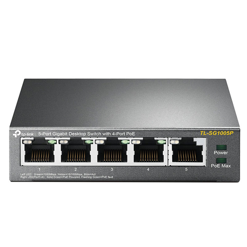 TP-LINK TL-SG1005P 5-Port Gigabit namizno stikalo-switch s 4-Port PoE zagotavlja enostavno in hitro omrežno povezavo in enostavno postavitev IP kamer in dostopnih točk, ki za napajanje uporabljajo PoE.