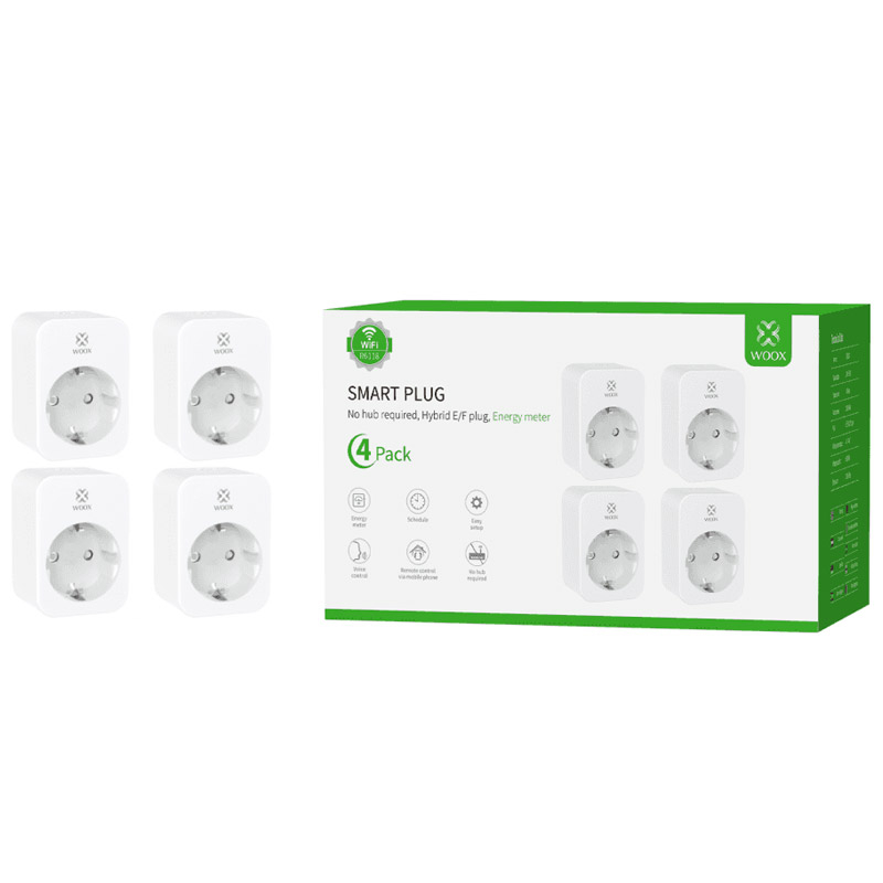 WOOX R6087-4pack WiFi komplet pametnih vtičnic omogoča nadzirajte svojih gospodinjskih aparatov, na daljavo preko Woox Smart Plug. Uporabite svoj mobilni telefon, da na daljavo prižgete električni kotliček, prižgete luči v dnevni sobi, zaženete čistilec zraka ali celo vklopite grelnik vode. Vse to naredite z le nekaj dotiki v intuitivni aplikaciji Woox Home.