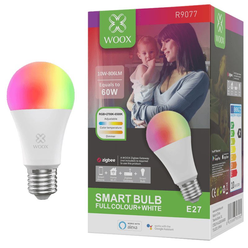 WOOX R9077 Smart Zigbee E27 2700K-6500K LED pametna žarnica omogoča zatemnjevanje in spreminjanje barve. LED žarnice boste lahko upravljali preko Amazon Alex-e in Google Asistentom z glasnovnim nadzorom. *