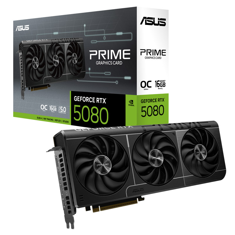 Prime GeForce RTX 5080 ima zasnovo z 2,5 režno zasnovo s skrbno urejeno postavitvijo ohišja, hladilnika in toplotnih cevi, ki omogoča trem ventilatorjem Axial-tech, da izkoristijo prezračevanje stranske plošče ohiš ja in zagotavljajo optimalno toplotno zmogljivost.