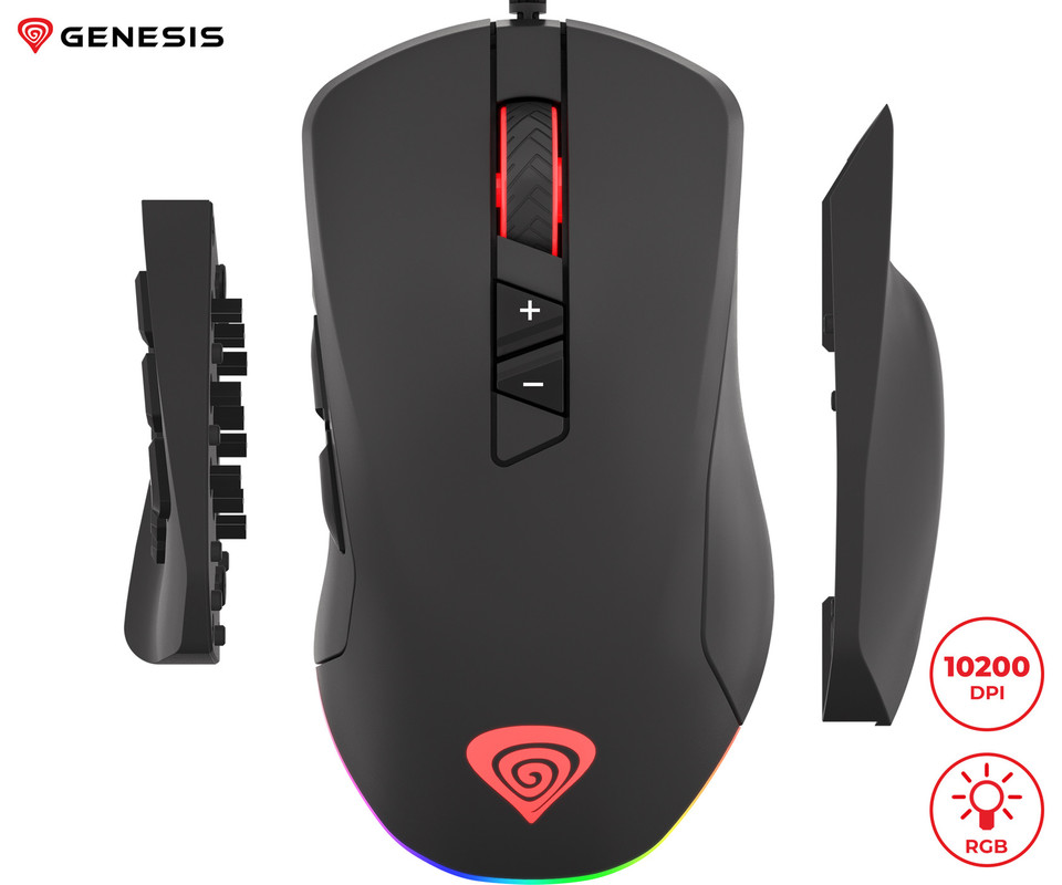 GENESIS Xenon 770 gaming optična miška, 10200DPI, RGB LED osvetlitev, 14 tipk, 2v1, zamenljiva plošča, vgrajen spomin, programska oprema, črna