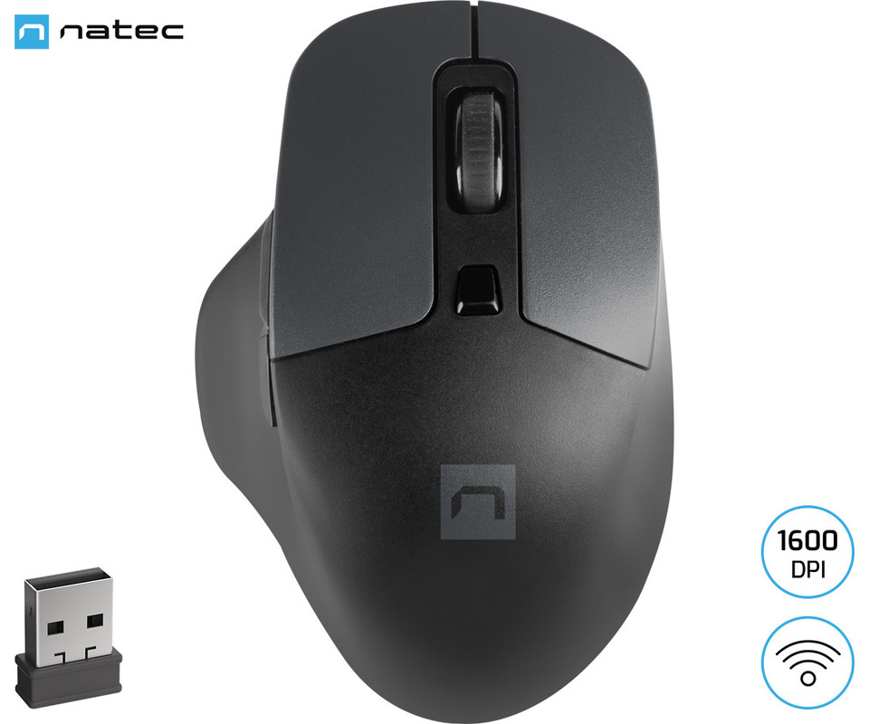 Natec BLACKBIRD 2 brezžična miška, ergonomska, USB 2.4GHz, 1600DPI, 6 gumbov, tiha stikala, 1x AA baterija, optični senzor, teflonski drsniki, črna