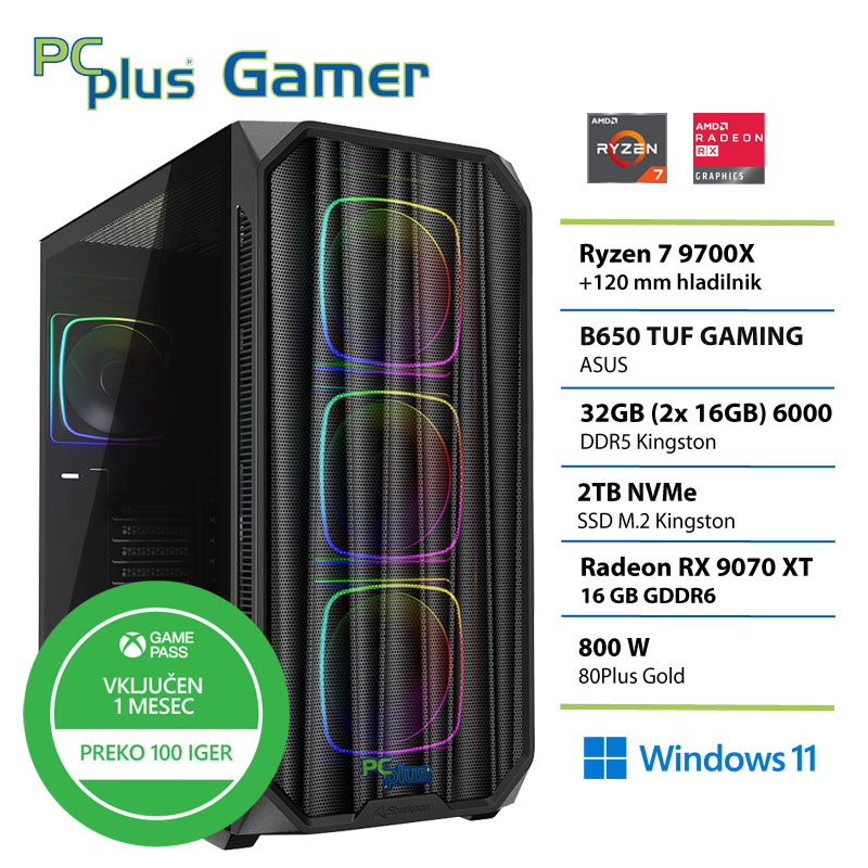 PCPLUS Gamer Ryzen 7 9700X 32GB 2TB SSD RX 9070XT Windows 11 Home + Xbox GP gaming namizni računalnik