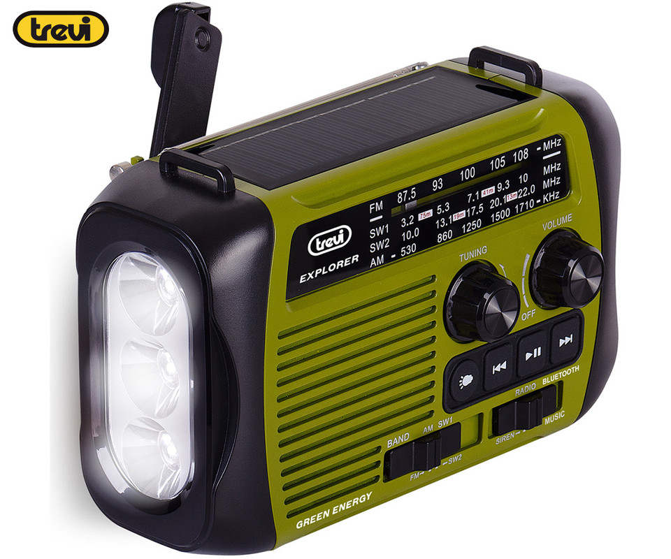 TREVI RA 7F30 BT DYNAMO radijski sprejemnik, 3v1, FM Radio, zvočnik, teleskopska antena, polnilna baterija, solarni panel, LED svetilka, retro izgled, prenosen, FM / AM / SW, USB, microSD, zeleno-črn