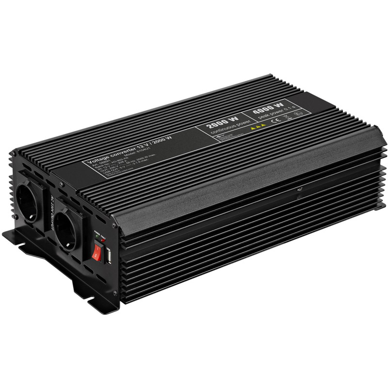 GOOBAY 12V-230V DC/AC USB-5V 2000W pretvornik/ napajalnik, pretvori 12V DC v 230 V AC za delovanje elektronskih naprav z 12V DC napajalnim sistemom. Naprava ima vgrajen USB priključek (2100mA) in dodatni ventilator. Ohišje ima na voljo zunanjo varovalko