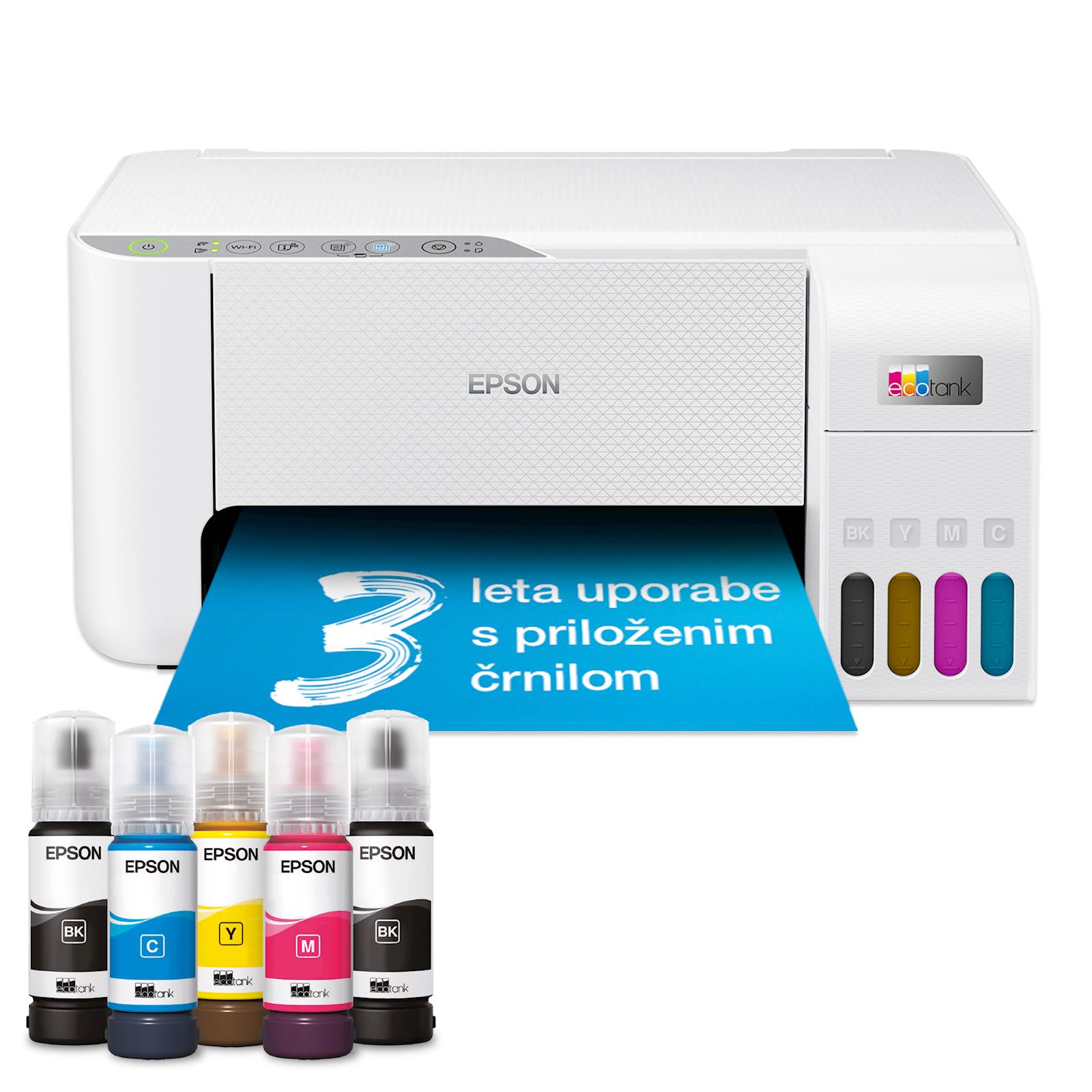 TISKANJE BREZ KARTUŠ! Uživajte v brezžičnem tiskanju in izjemno nizkih stroških tiskanja na stran z večopravilno napravo Epson EcoTank L3276. Posode s črnilom z izjemno visoko kapaciteto omogočajo polnjenje brez packanja, posebna oblika stekleničk pa zagotavlja polnjenje posod s pravo barvo. Tiskalnik je odlična izbira za domačo uporabo, saj omogoča šolarjem, dijakom in študentom brezskrbno tiskanje. Tiskalnik lahko z lahkoto upravljate tudi z novo mobilno aplikacijo Epson Smart Panel. S tehnologijo tiskanja brez toplote Micro Piezo Heat-Free lahko uživate v manjši porabi energije in manjši potrebi po nadomestnih delih. Tiskalna glava je vnaprej nameščena, zato je namestitev tiskalnika nezahtevna.
