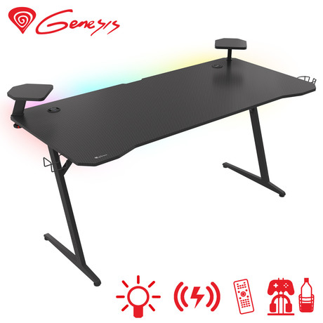 GENESIS HOLM 510 RGB gaming miza, profesionalna, ergonomska, RGB LED osvetlitev, stojala za zvočnike, nosilci za pijačo / gamepad / slušalke, 3x USB Type-A vhod, brezžični polnilec, karbon stil, črna