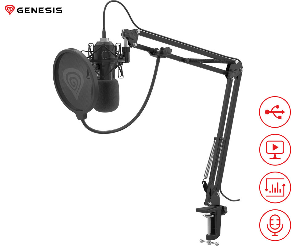 GENESIS RADIUM 400 G2 profesionalni mikrofon, namizni / studijski, 192kHz, gumbi za upravljanje, gumb MUTE, gumb GAIN, nastavljiva roka / nosilec / stojalo, USB Type-A, USB Type-C, PC, črn
