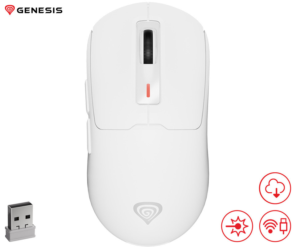 GENESIS ZIRCON 660 PRO brezžična miška, gaming / pisarniška, 26.000DPI, USB 2.4GHz / Bluetooth / USB Type-C, 6 gumbov, polnilna baterija, spomin, programska oprema, Plug & Play, bela