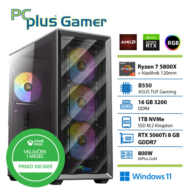 PCPLUS Gamer Ryzen 7 5800X 16GB 1TB SSD RTX 5060 Ti 8GB Windows 11 Home + Xbox GP gaming namizni računalnik
