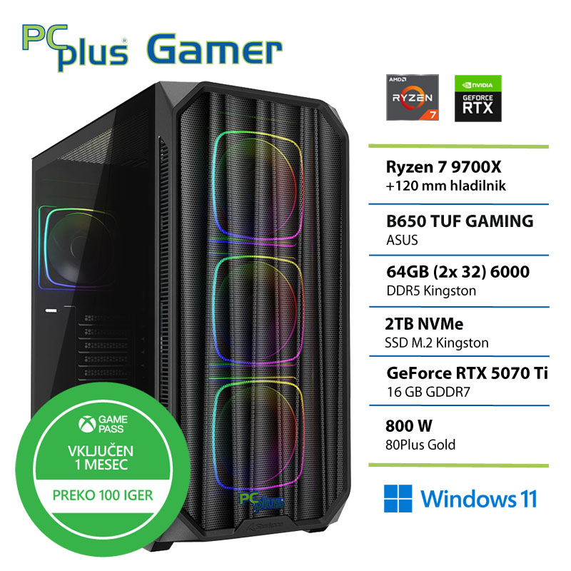 PCPLUS Gamer Ryzen 7 9700X 64GB 2TB NVMe SSD RTX 5070 Ti 16GB Windows 11 Home gaming namizni računalnik