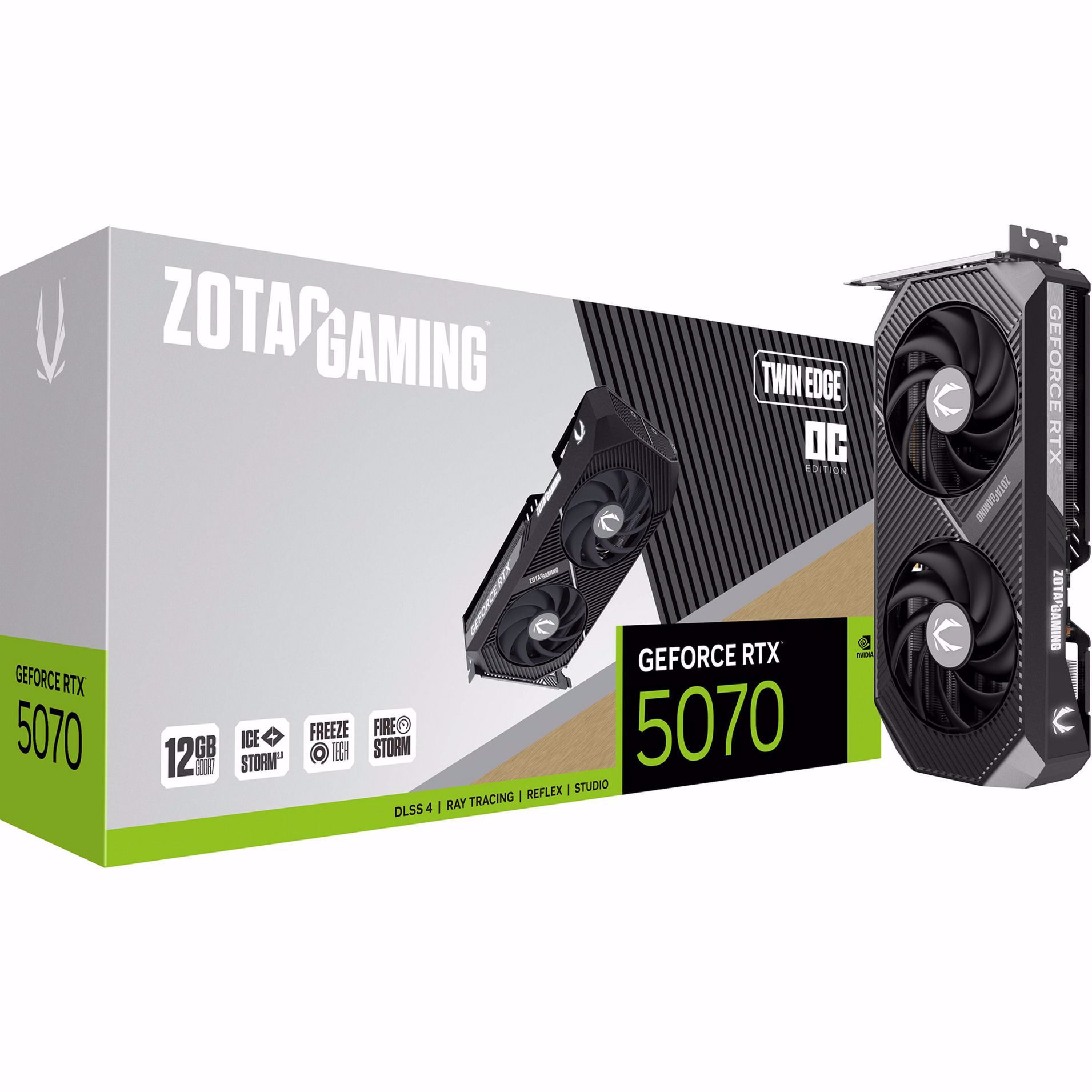 ZOTAC GeForce RTX 5070 Twin Edge OC je vrhunska grafična kartica z grafičnim procesorjem NVIDIA GeForce RTX 5070. Zmogljive grafične kartice serije GeForce RTX 50 temeljijo na arhitekturi NVIDIA Blackwell in ponujajo nove ravni realizma v igrah, hitrosti in energijske učinkovitosti, skupaj s funkcijami umetne inteligence, kot so generiranje sličic, generiranje več sličic in realistične izkušnje navidezne resničnosti. Dodatne funkcije vključujejo sledenje žarkom v realnem času, rekonstrukcijo žarkov, NVIDIA Ansel s celovitimi orodji za ustvarjanje posnetkov zaslona v igri, NVIDIA G-SYNC, G-SYNC HDR, NVIDIA DLSS 4, ShadowPlay, Highlights, NVENC Gen 9 ter kodirnik in dekoder AV1. Grafični procesor se ponaša s 6144 jedri CUDA. Njegovih 12 GB pomnilnika GDDR7 je povezanih prek 192-bitnega pomnilniškega vmesnika.